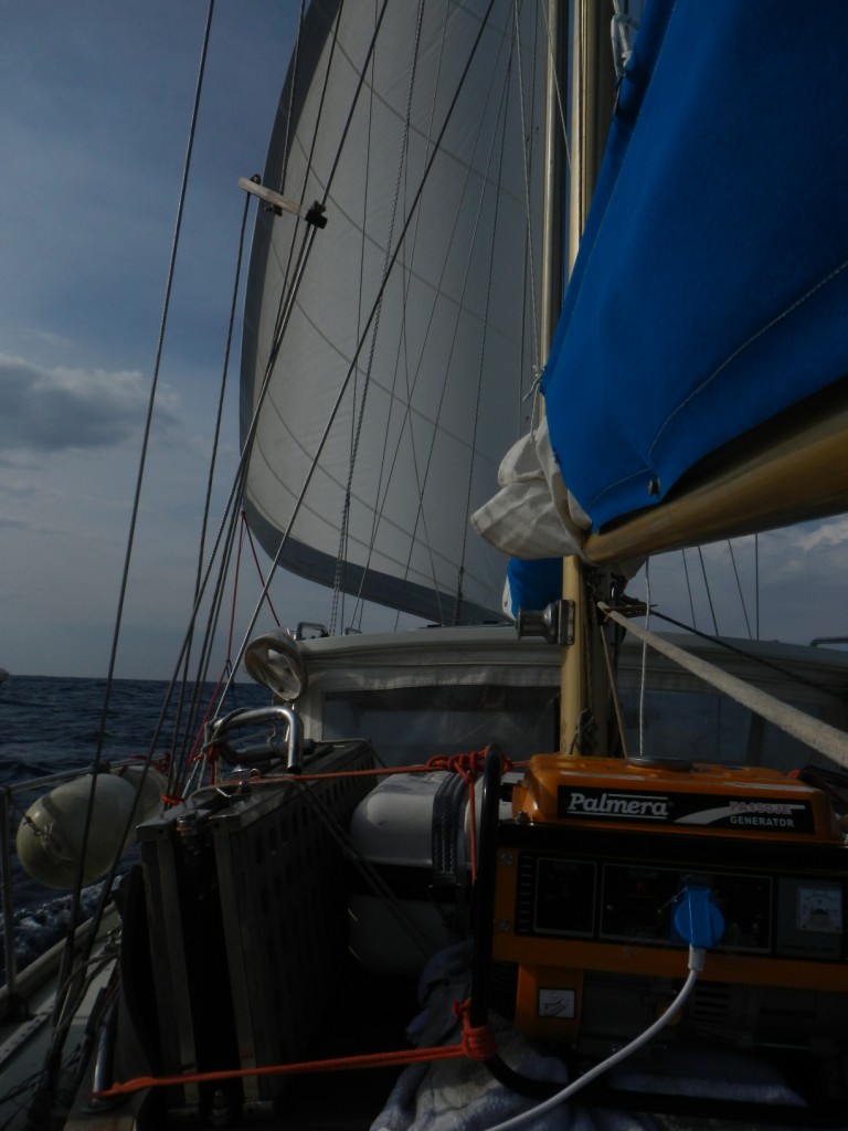 The 5/11 we depart Kalamata, bound for Sicily. We expect to motor against light winds for 2/3 of the way. After a little scare early on (water in the bilge), everything is fine except for the uncomfortable motion, motoring in the waves. When the (good) wind comes, at night, we soon need to reduce sail. And we realise there are a few things that do not work the way we expect, in the deck hardware arrangement. It is going to be a learning process and an improvement process. We fight with the genoa furler line and the friction in its tortuous path; we fight with the genoa sheet when it wrestles open a snatch block; we fight with the steering wheel when the boat gets overpowered. But the wind abates a bit, the speed is good, the night goes by and the day after, 8/11 we arrive safely in Siracusa. This boat can sail, don't call her a motorsailer.
